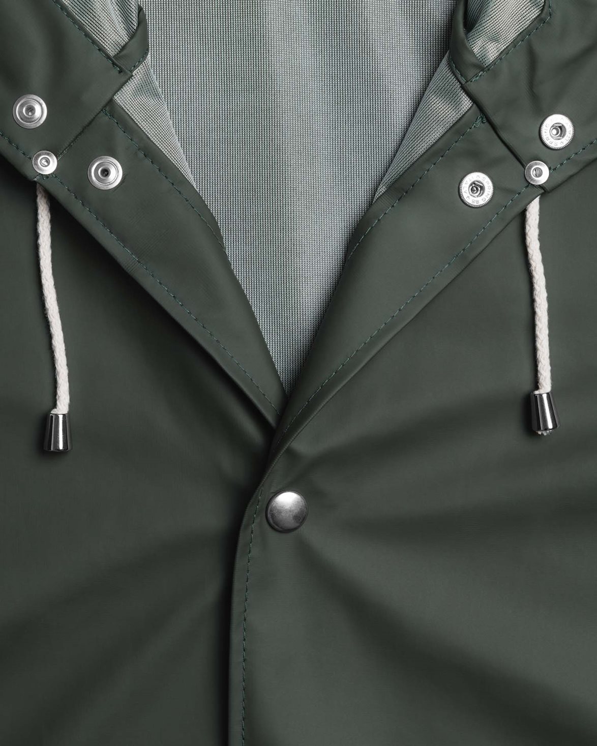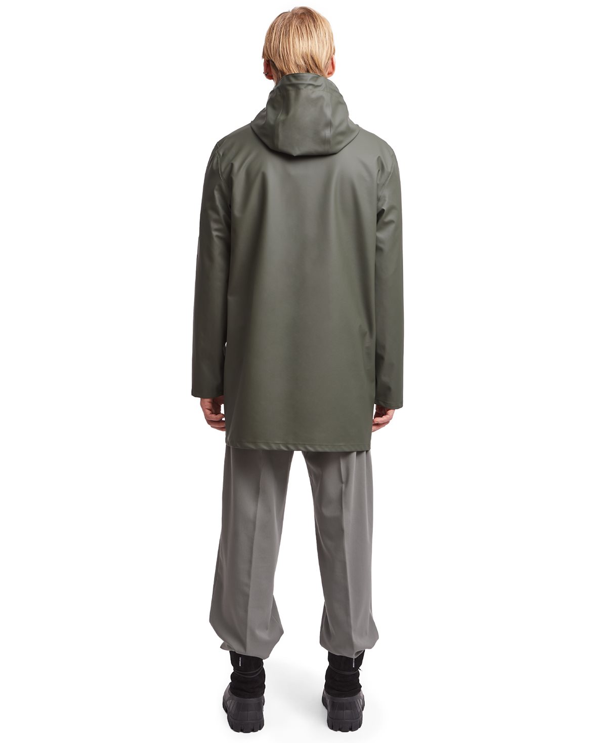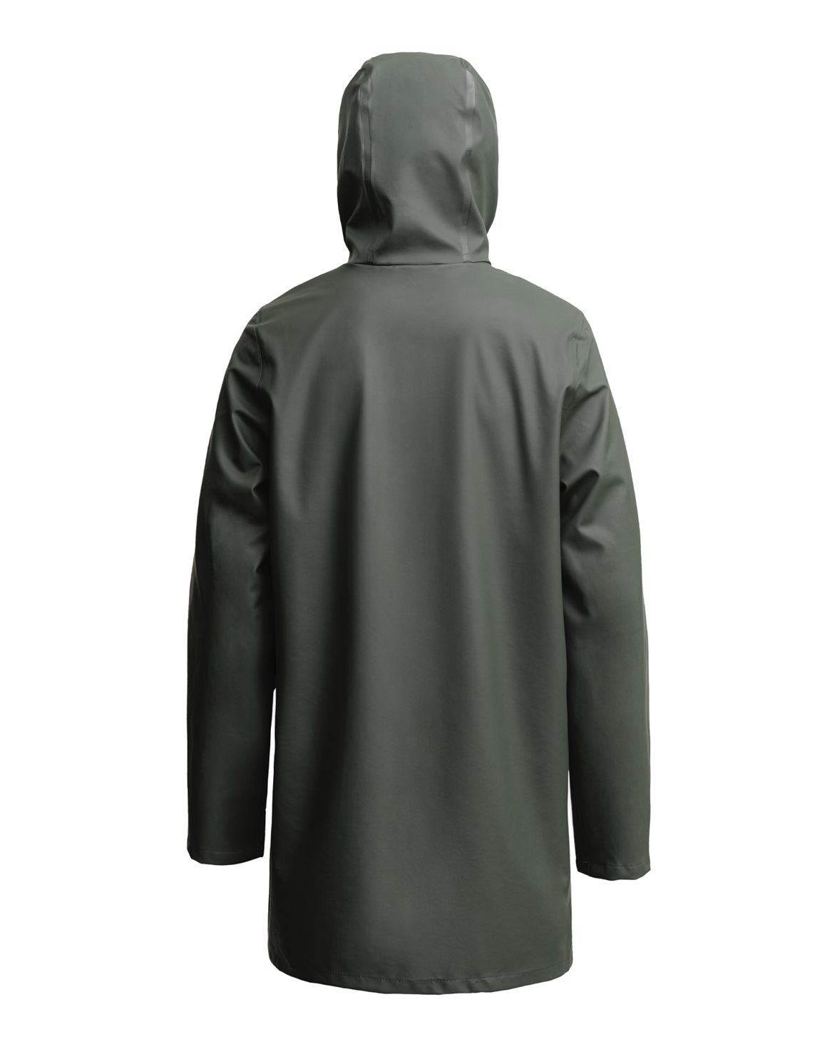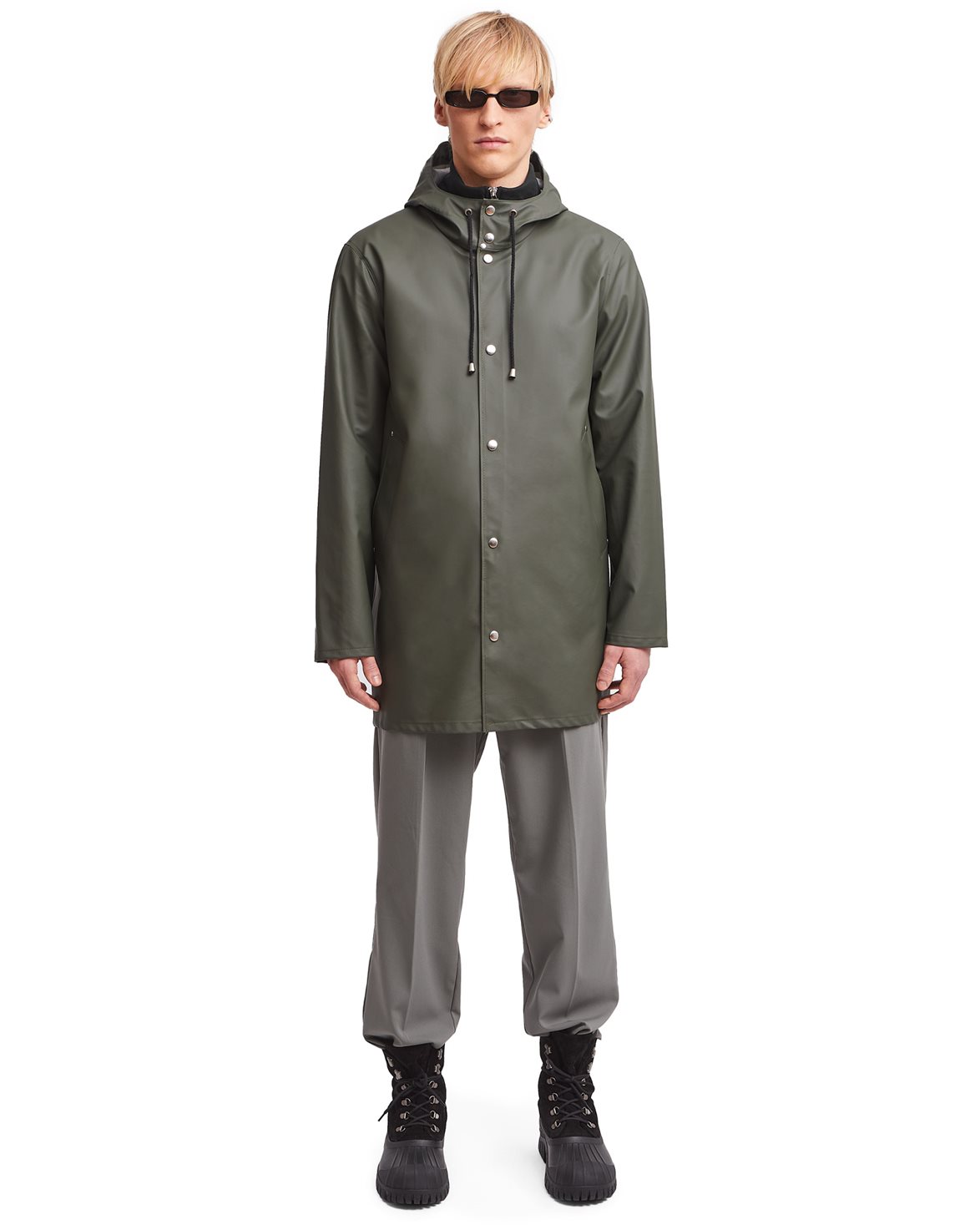 Classic raincoat from Stutterheim. Stockholm Raincoat is a thinner version than the classic Stockholm Raincoat. The jacket is handcrafted in Europe from light-weight rubberized cotton. The jacket features two side pockets, a drawstring hood, and a snap button closure.