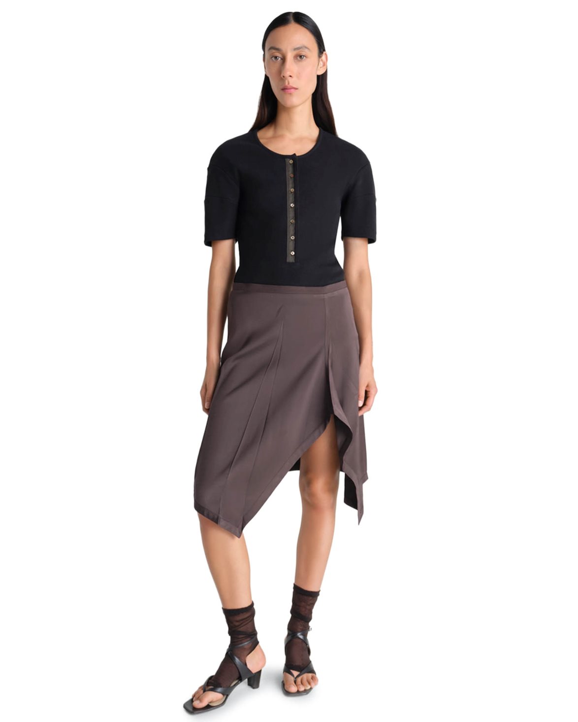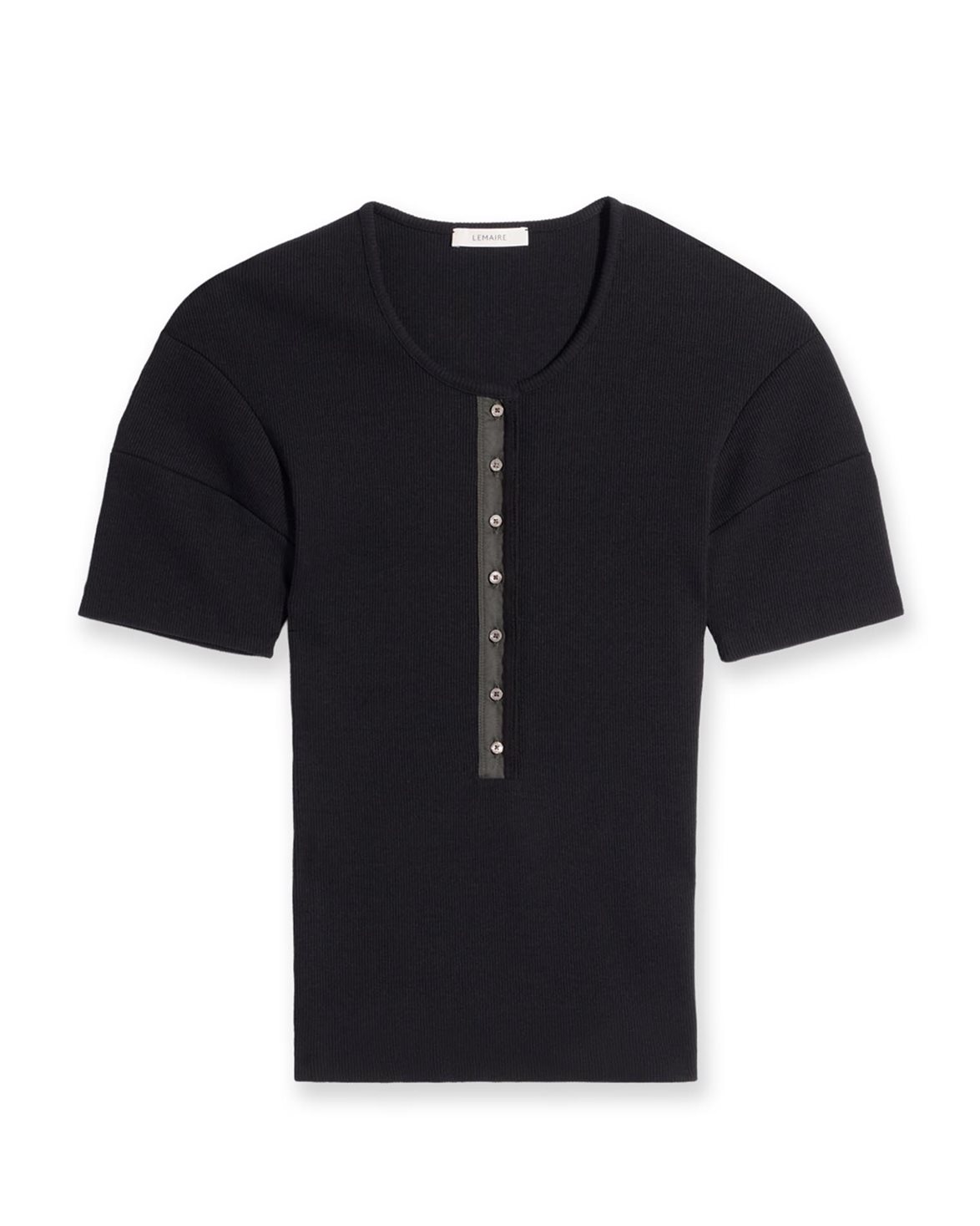 Top from LEMAIRE. Fitted Henley has a fitted silhouette and is crafted from a ribbed cotton and linen jersey. The garment features a decorative button placket with mother-of-pearl buttons, as well as sculptural pleats at the shoulders.