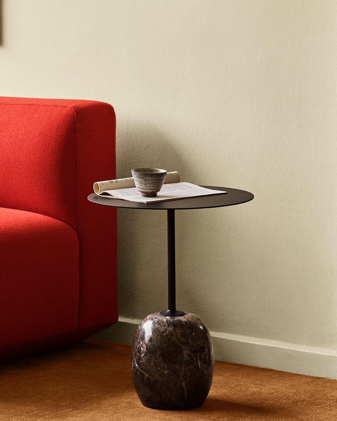 Side table from &Tradition. Lato Side Table LN8 is designed by Luca Nichetto and features a slim, round tabletop balanced on an oval base. The table is made of marble, turned on a lathe and polished to a semi-matt finish, with a frame and tabletop in powder-coated steel.
