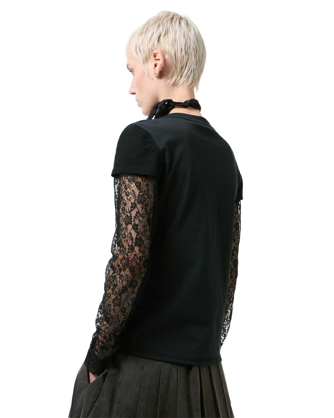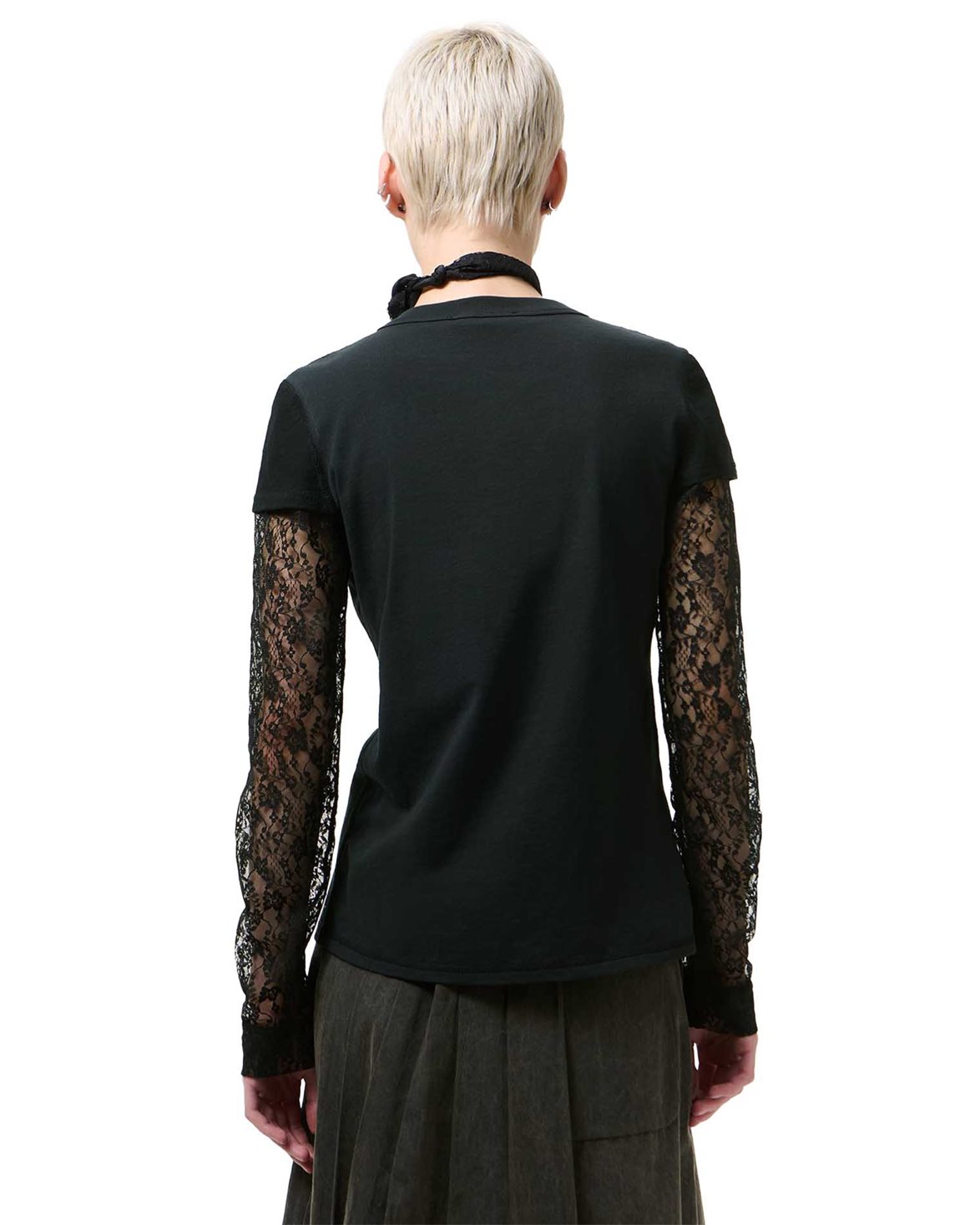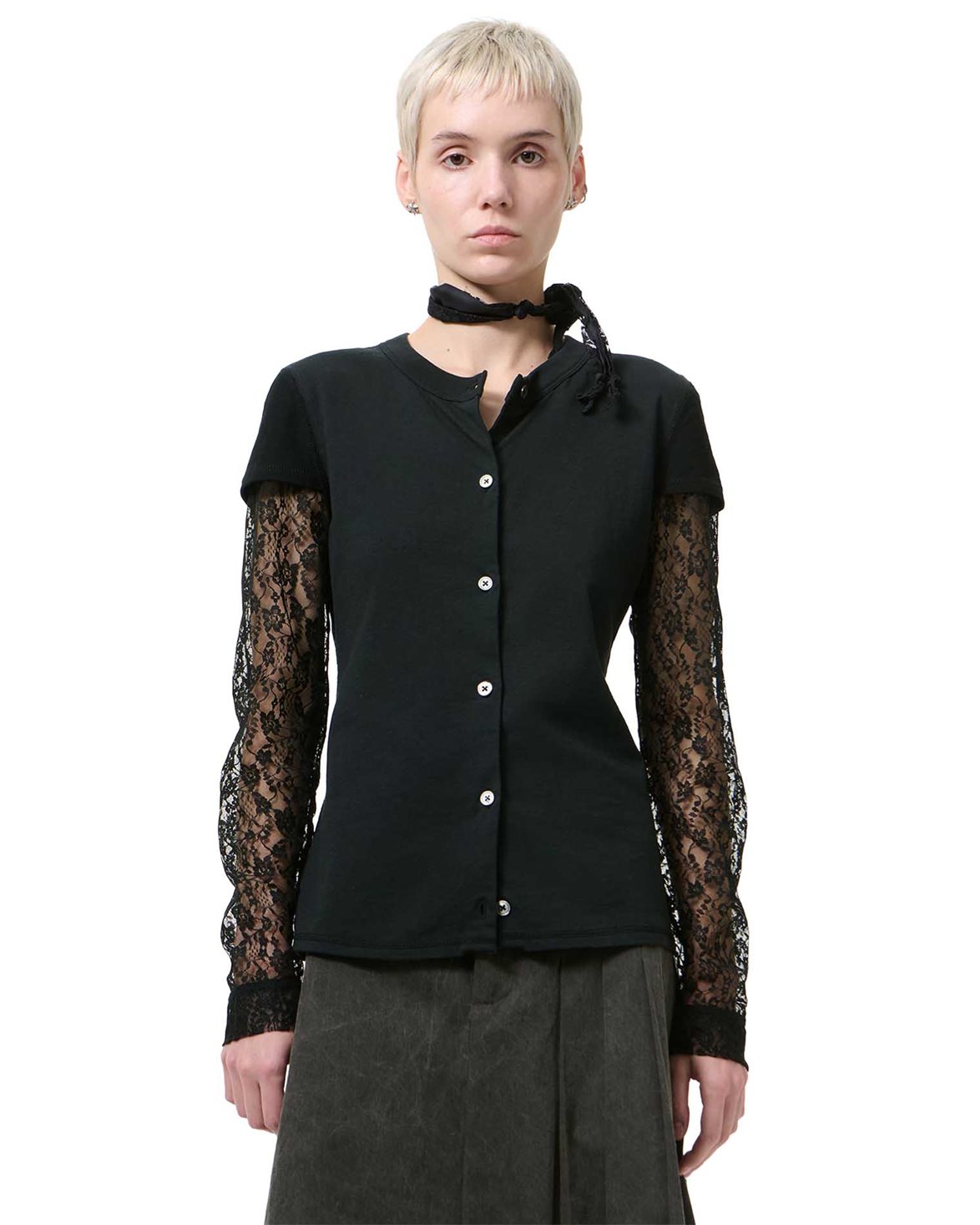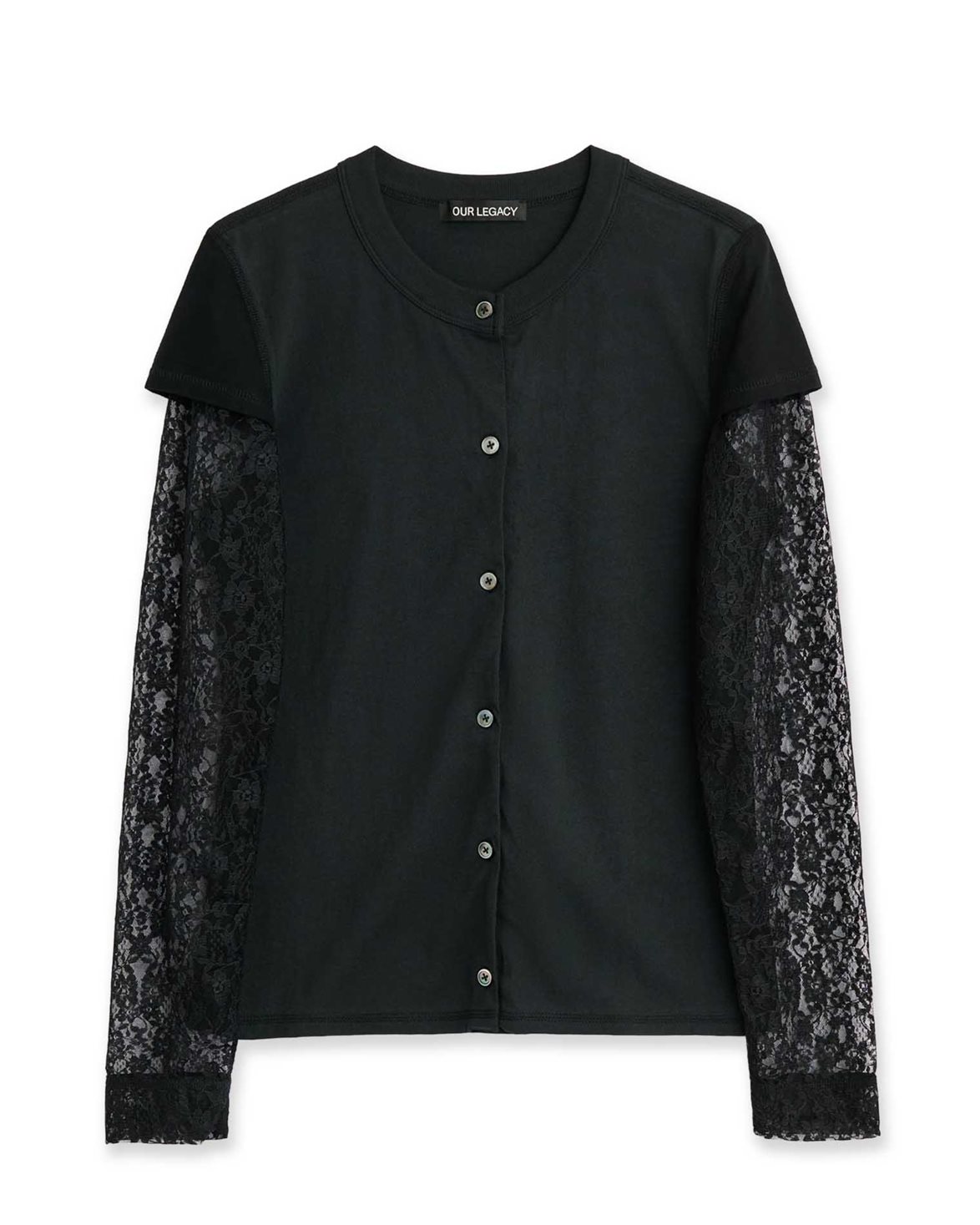 Top from Our Legacy. Heat Longsleeve is designed with a relaxed fit and features a button-up front. The top is equipped with lace sleeves that create an elegant contrast to the clean front. It is finished with a subtle stand collar and refined detailing.