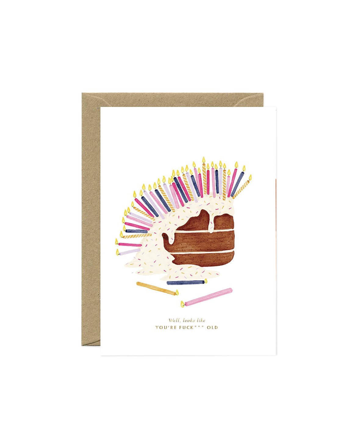 Double-folded card in A6 format. Looks Like You're Old Card is printed in France on 300 gsm off-white FSC-certified paper, featuring a colorful illustration on the front and paired with a natural-colored envelope.