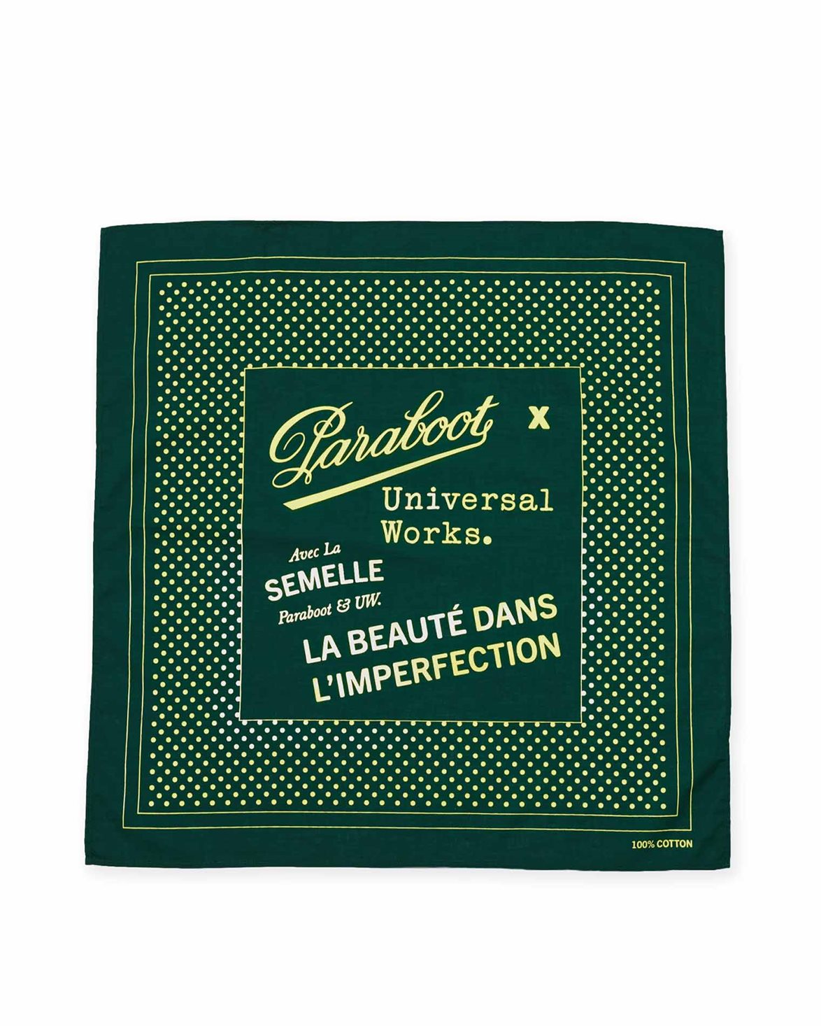 Bandana från Universal Works. Neckerchief Paraboot är en fyrkantig scarf som kan bäras runt halsen eller i bröstfickan och är dekorerad med ett exklusivt Paraboot x Universal Works-tryck. Den är tillverkad i lätt och luftig bomull av högsta kvalitet.