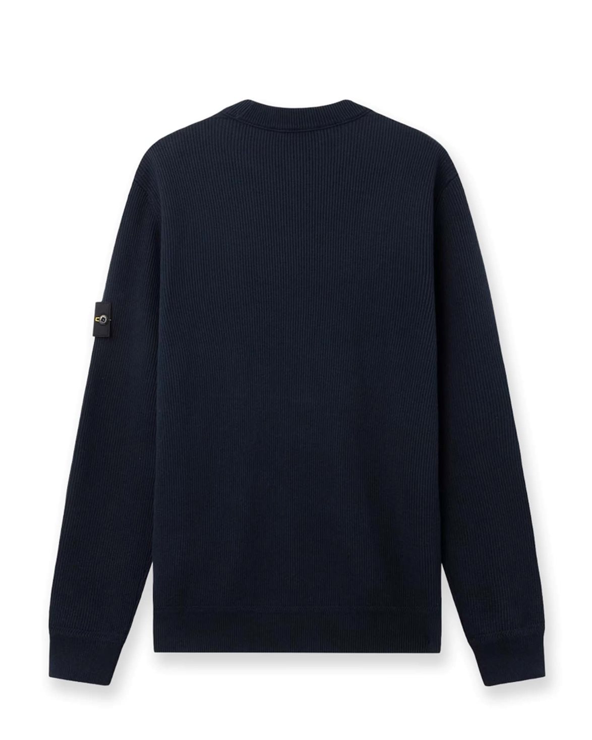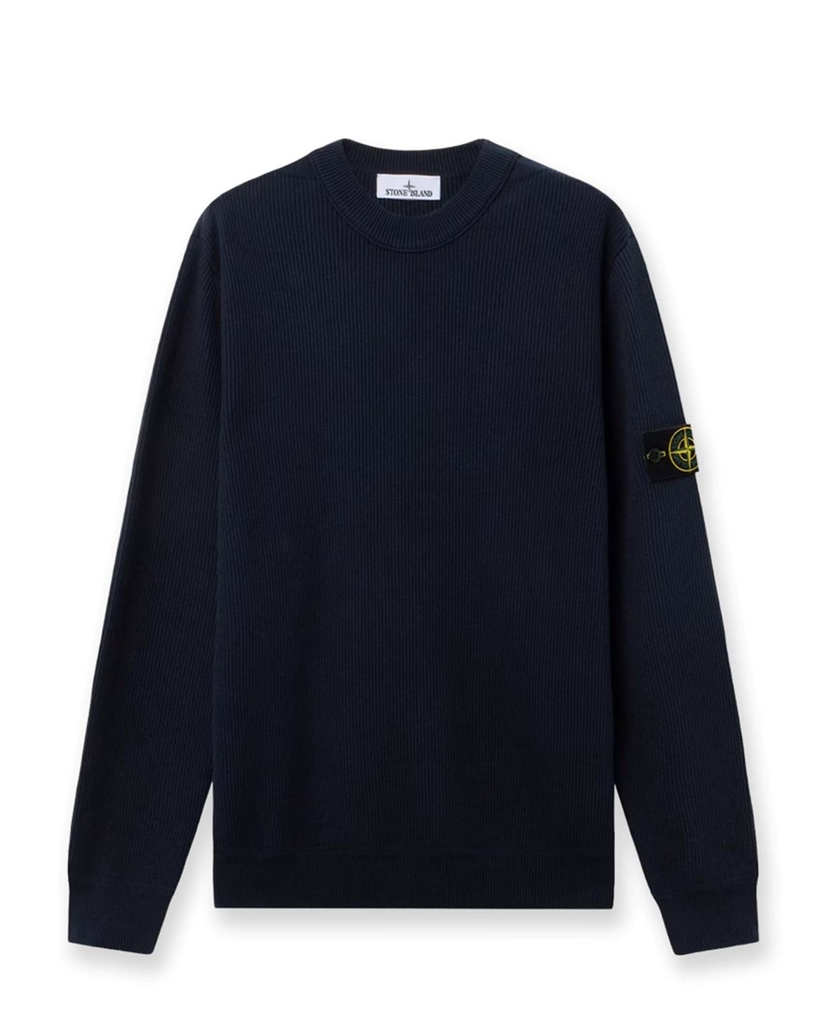 Rundhalsad tröja från Stone Island. 5100154 Ribbed Cotton Crewneck Sweater är tillverkad av mjuk, ribbad ekologisk bomull och har en normal passform. Tröjan är försedd med ribbad halslinning, muddar och nederkant i finare ribbstickning samt ett Stone Island-märke på vänster arm.