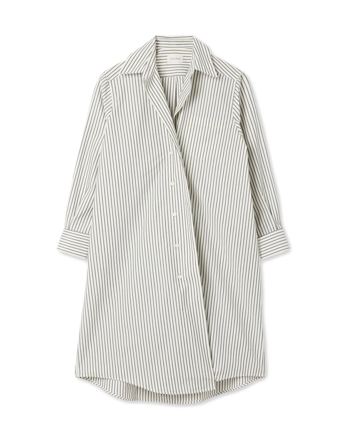 Skjortklänning från House of Dagmar. Asymmetric Dress är tillverkad av ekologisk bomull och har en avslappnad passform. Klänningen är försedd med en klassisk krage och försluts med en asymmetrisk helknäppning framtill.