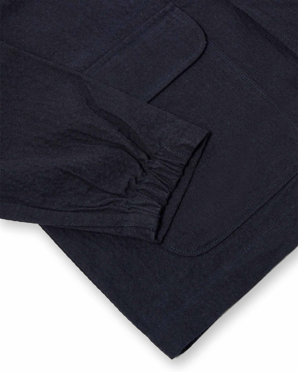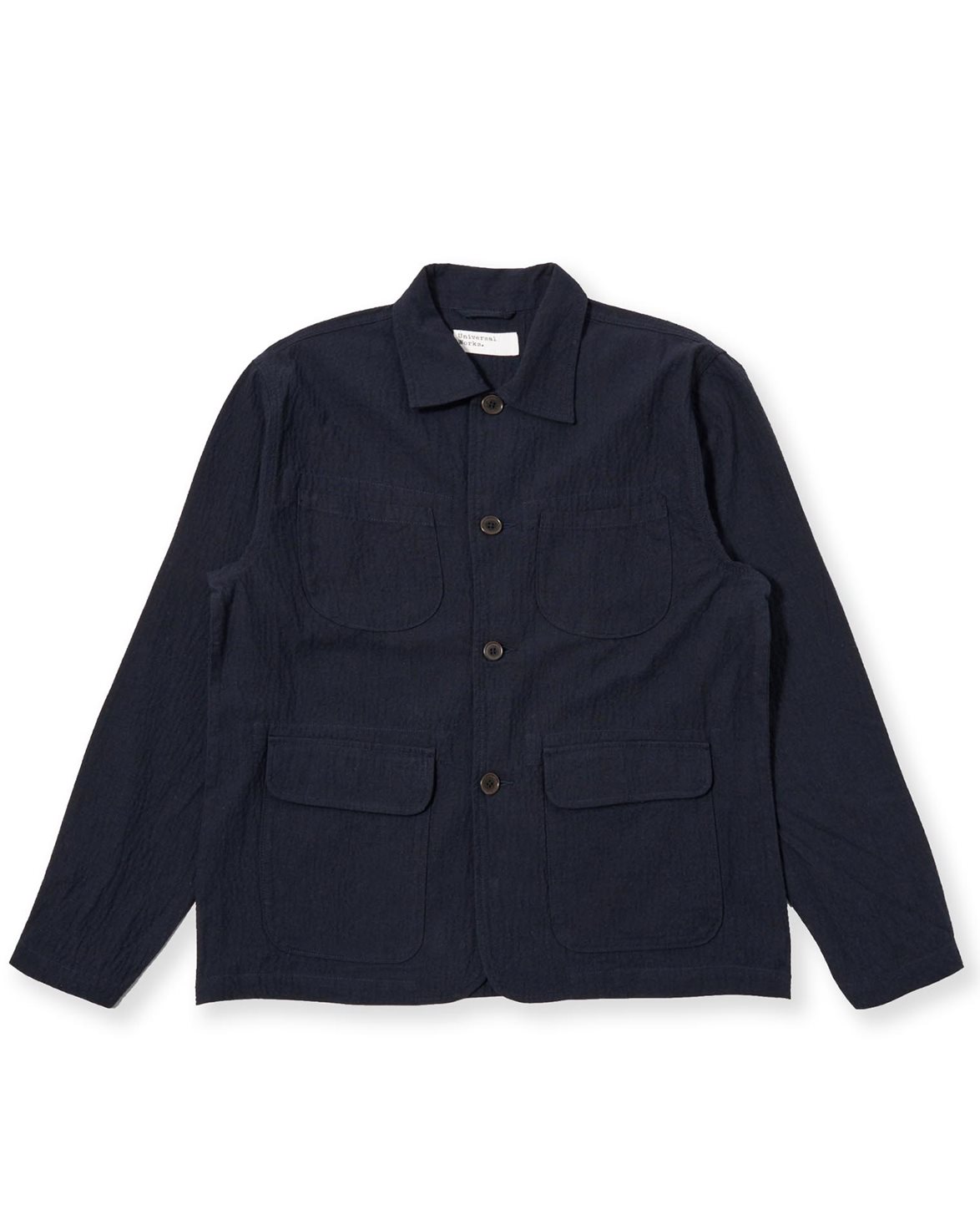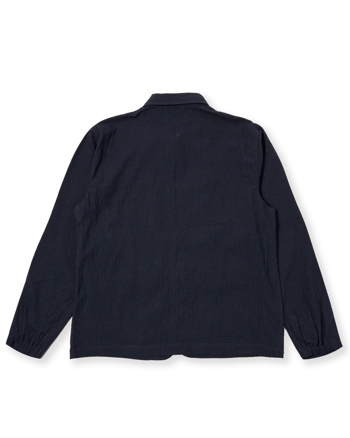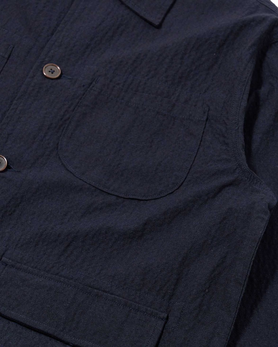 Jacka från Universal Works. Labour Jacket är en jacka med vid och ledig passform, klassisk krage och fyra utanpåliggande fickor varav två bröstfickor och två nedre fickor med lock. Modellen kombinerar traditionella arbetsplaggsdetaljer med en uppdaterad konstruktion. Tillverkad i ett luftigt tyg med enkel vävstruktur i en blandning av återvunna fibrer som skapar en subtil seersucker effekt och en torr känsla i materialet. Fiberblandningen ger även en lätt melerad struktur mot den mörkblå basen.