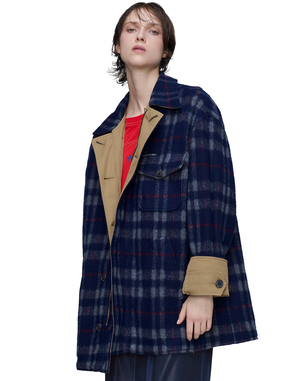 Jacka från Maison Margiela. Reversible Twill Check Jacket är designad för att vara vändbar vilket ger ett lager på lager intryck. Jackan är försedd med dubbelknäppt stängningen, justerbara ärmsluten samt varumärkets ikoniska fyra stygn på ryggen.