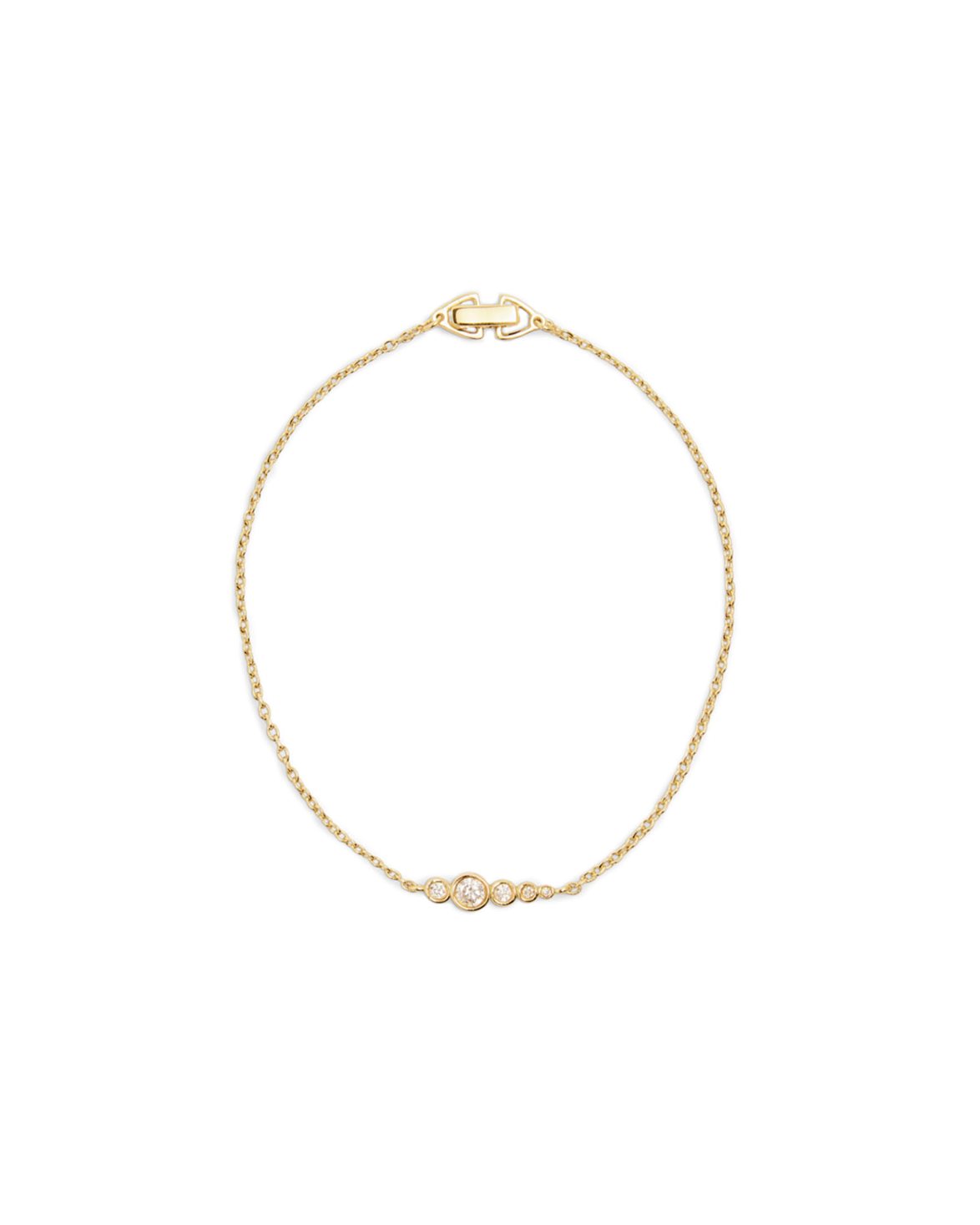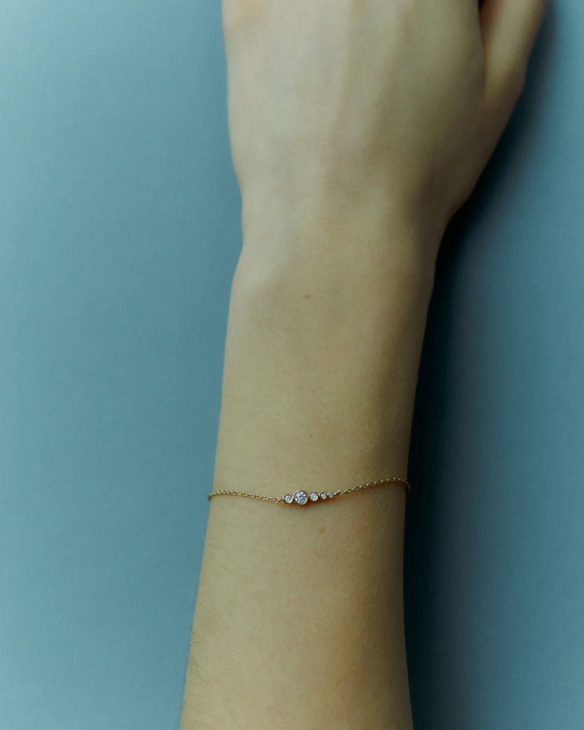 Armband från RAGBAG. Ottilia Bracelet är tillverkat för hand av 18K guldpläterad 925 sterling silver. Armbandet är designat med en tunn kedja och 5 stycken vita Cubic Zirconia stenar i olika storlekar.