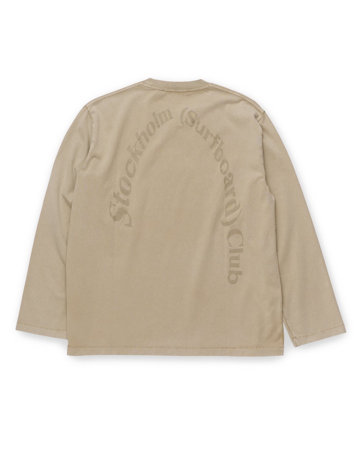 Långärmad t-shirt från Stockholm Surfboard Club. Greg Back Logo Long Sleeve är tillverkad i mjuk ekologisk bomull och har en boxig, avslappnad passform. Tröjan är försedd med en ribbad krage och varumärkets vintageinspirerade tryck på ryggen som är krackilerat för en vintage look.