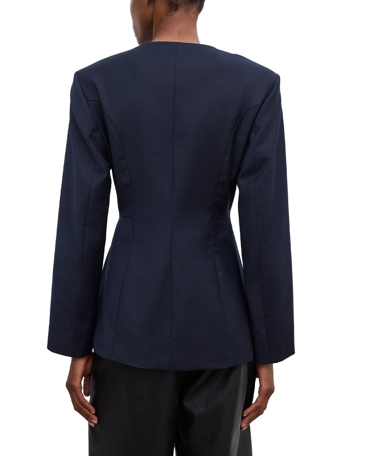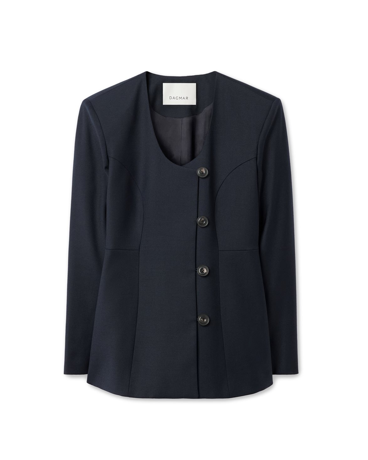 Kavaj från House of Dagmar. Sb Collarless Blazer är tillverkad av en polyester- och ullblandning och har en figurnära passform. Kavajen är försedd med en djup halsringning utan krage och förslutande knappar.