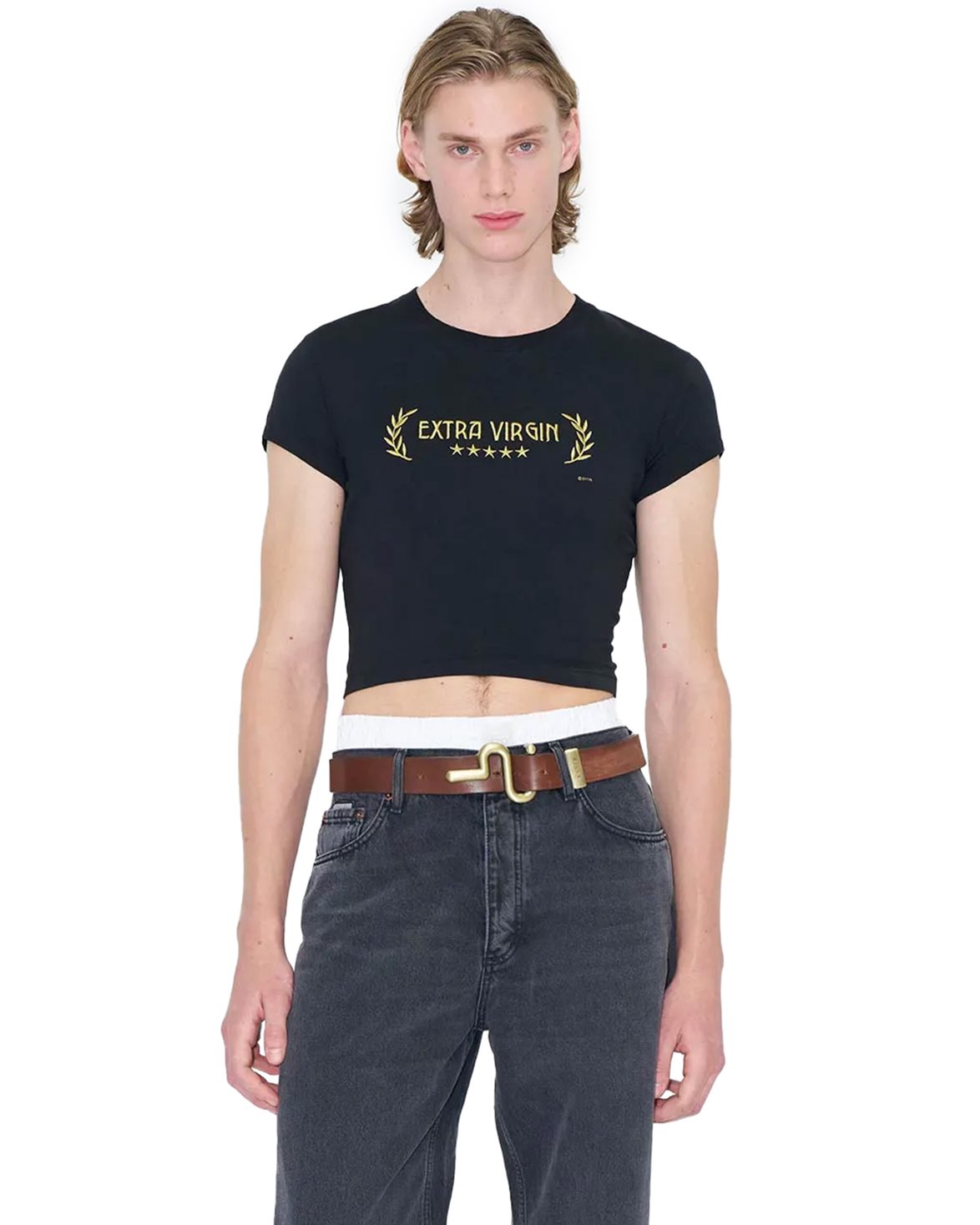 T-shirt från Eytys. Zion T-Shirt är tillverkad av mjuk och stretchig ekologisk bomull och är designad med en figurnära passform och en croppad silhuett. Tröjan är försedd med texten "Extra Virgin" broderad över bröstet.
