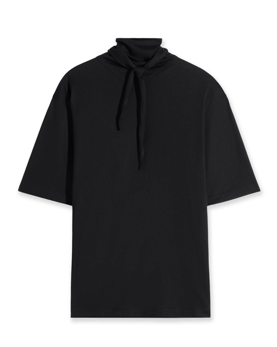 Blus från LEMAIRE. T-Shirt With Foulard är tillverkad i lätt och följsam bomullsjersey som ger materialet en mjuk känsla och en diskret sidenliknande lyster. Modellen har en boxig passform med kort ärm samt en ståkrage med V-formad bas som övergår i en fastsydd scarf, vilken kan knytas på valfri sida av halsen eller falla framtill, kompletterad med genomarbetade sömdetaljer vid fåll och halsringning.