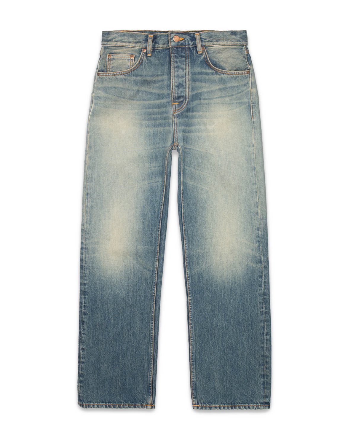 Jeans från Nudie Jeans. Tuff Tony Jeans är tillverkade i 14.2 oz. rigid denim av regenerativ ekologisk bomull med loose fit, hög midja och vida ben. Jeansen har en solblekt tvätt med blekta streck och dämpade kontraster, orange sömmar vid sömmarna, kopparfärgade metalldetaljer, knappgylf och jacron-patch.