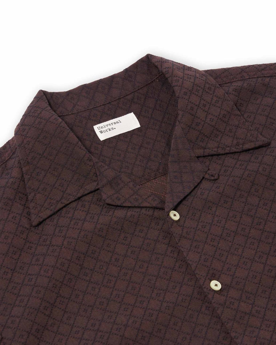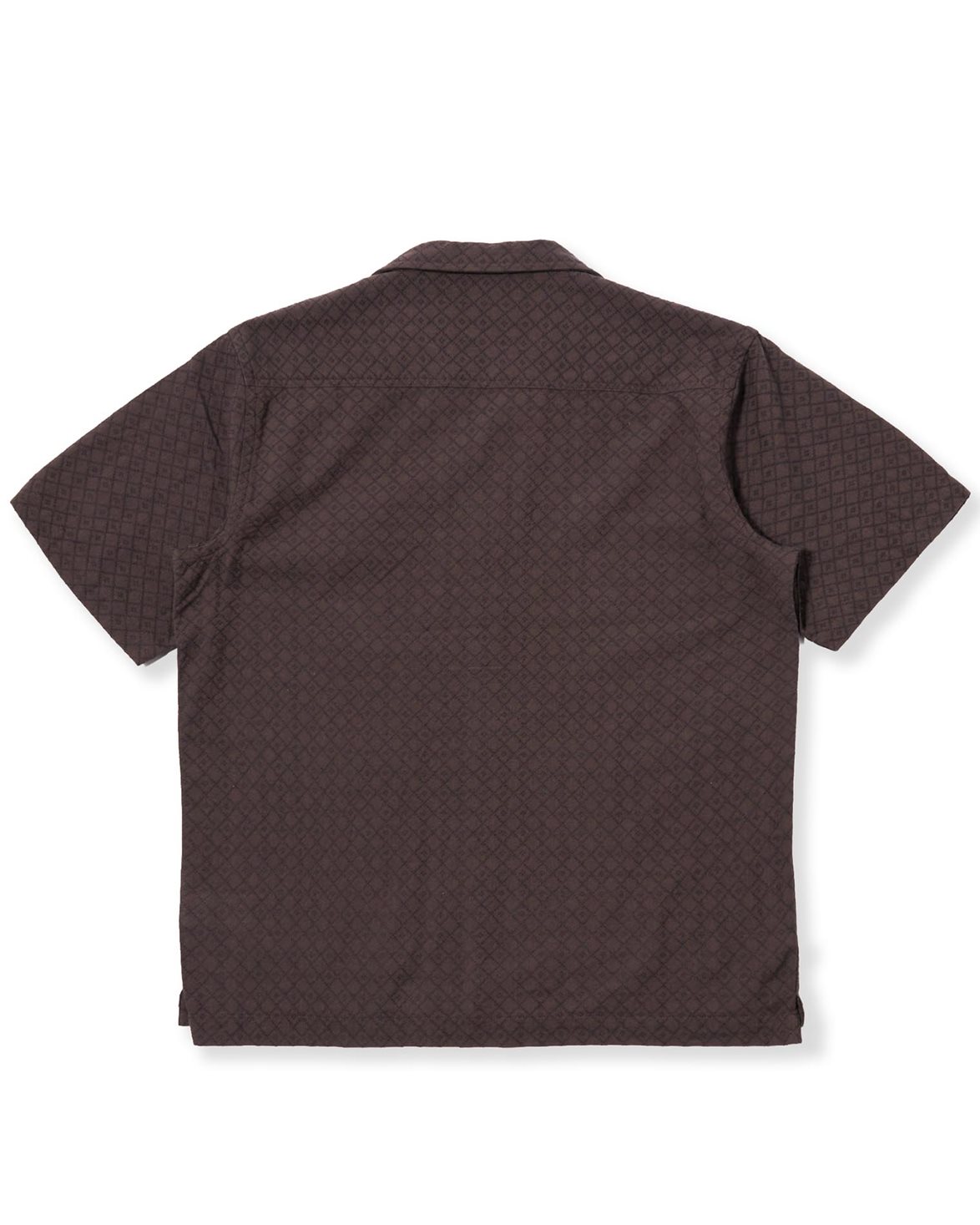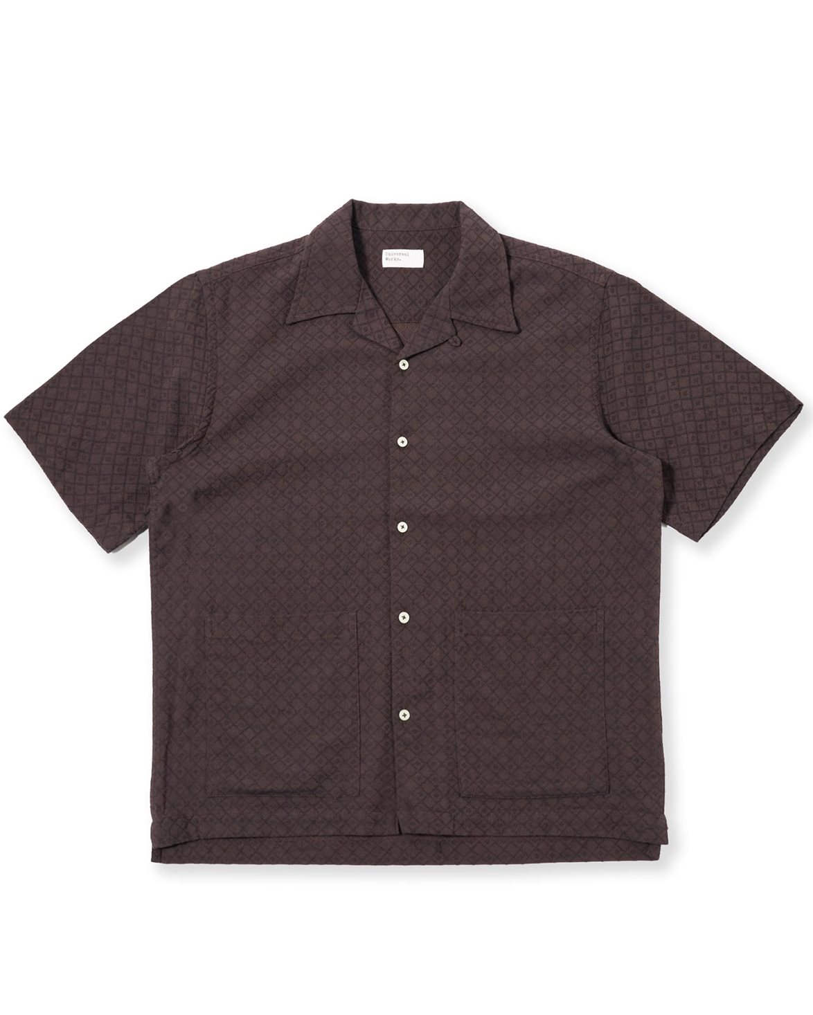Skjorta från Universal Works. Deck Short Sleeve Shirt är en kortärmad skjorta med vid passform och två frontfickor. Modellen har en enstyckskragi, korta löst skurna ärmar och en sidosprund i nederkanten som är något längre baktill. Tillverkad i ett strukturerat dobbytyg med ett diamantmönster i mörkbrunt och svart.