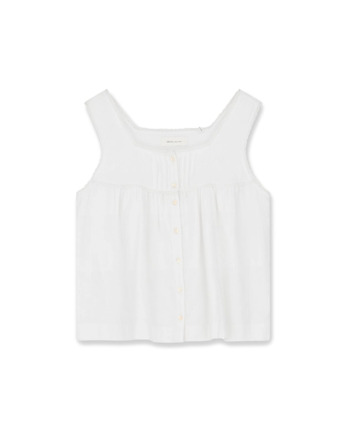 Topp från Skall Studio. Clea Top är tillverkad av ekologisk bomull och har en avslappnad passform med en volymös siluett. Toppen är försedd med knappar framtill och en fyrkantig halsringning med spetsdetalj.