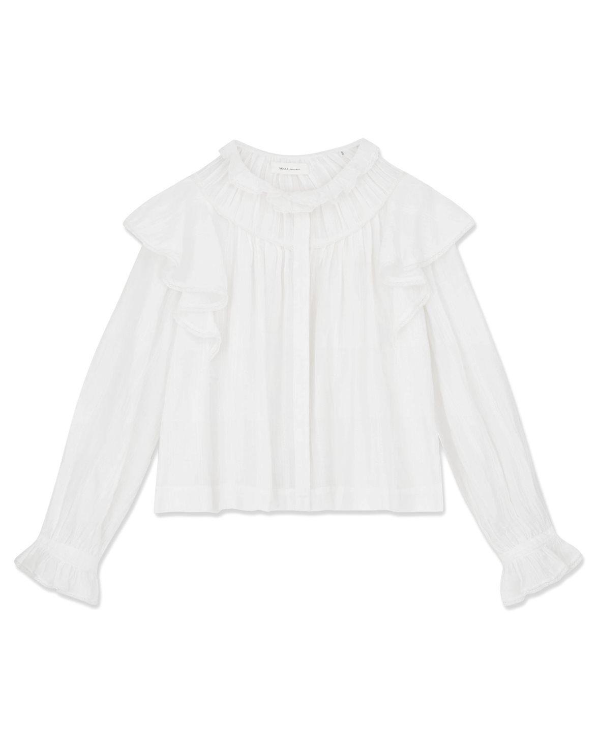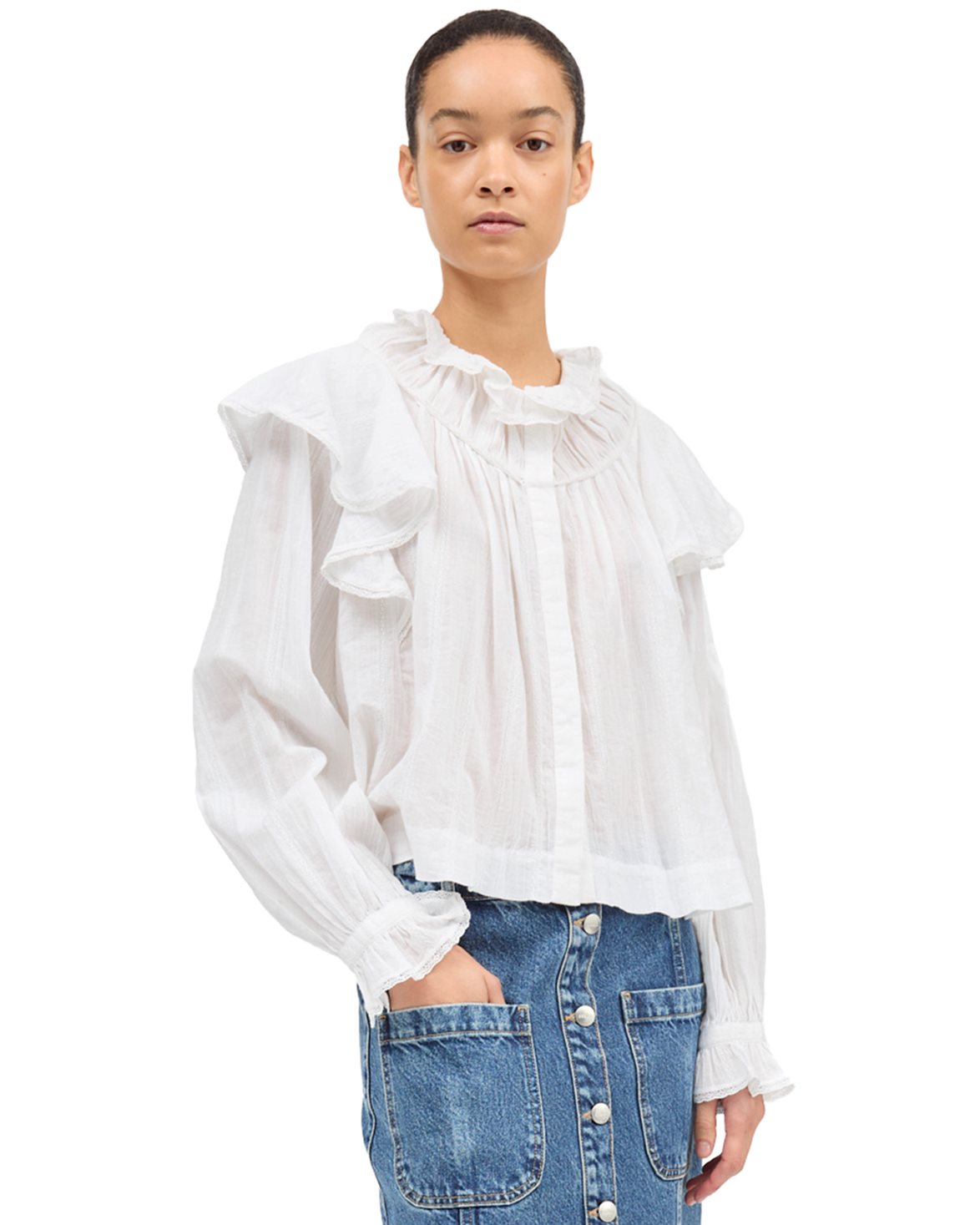 Blus från Skall Studio. Clea Shirt är tillverkad av ekologisk bomull och har en klassisk design med rundad halsringning. Blusen är försedd med knappar framtill och har långa ärmar med knappade manschetter samt volangdetaljer.