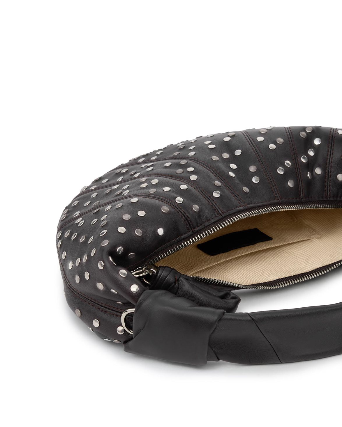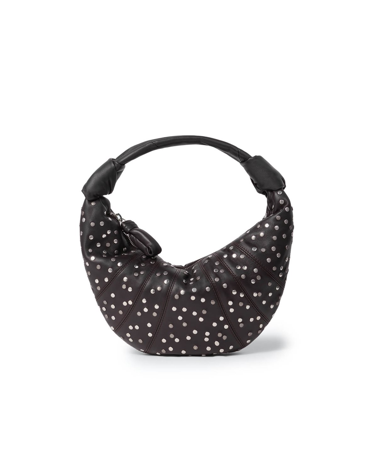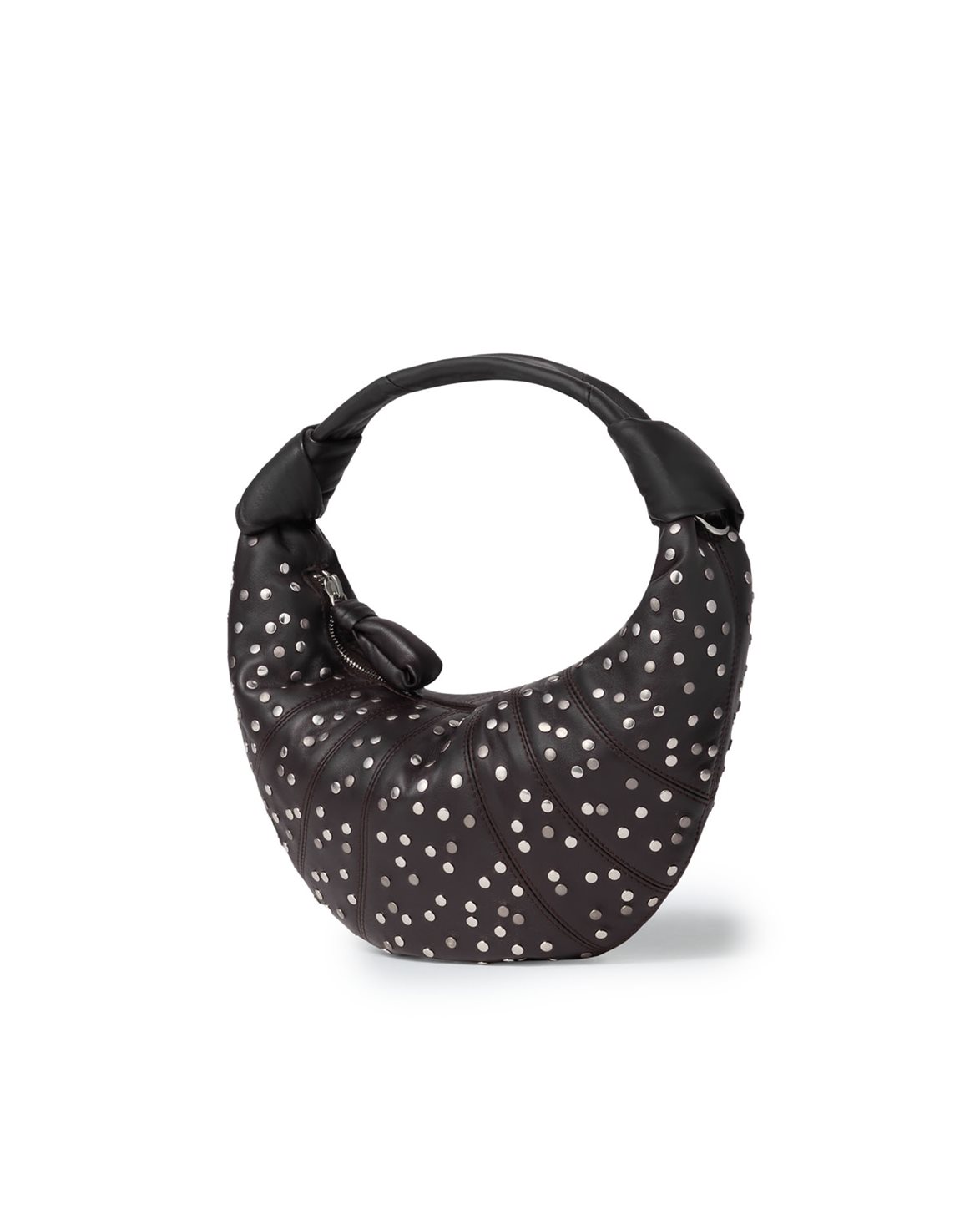 Handväska från LEMAIRE. Studs Dots Mini Fortune Croissant Bi Galva är tillverkad i mjukt nappaläder och prydd med dekorativa metallnitar som ger en subtil men distinkt karaktär. Den ikoniska designen är inspirerad av formen på en croissant och kännetecknas av toppsydda läderpaneler som skapar en elegant och genomarbetad silhuett med både struktur och rörelse.